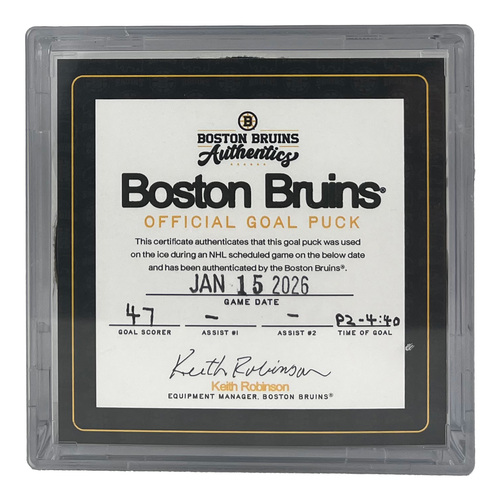 Game-Used Official Game Puck used during the game on 1/15/2026 vs. Seattle Kraken. Bruins Goal Puck scored shorthanded by Mark Kastelic. Unassisted.